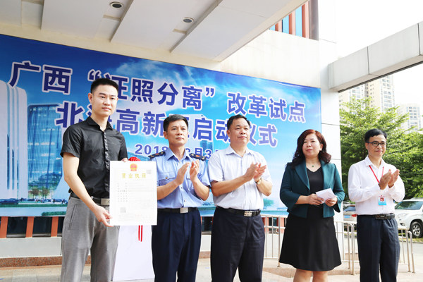 8月3日上午,廣西“證照分離”改革試點北海高新區(qū)啟動儀式在北海高新區(qū)順利舉行。 正五北部灣海洋科技創(chuàng)新港入駐企業(yè)廣西寰游進出口貿(mào)易有限公司代表從市工商局局長鄧金雄手中接過營業(yè)執(zhí)照,成為創(chuàng)新港入駐企業(yè)“證照分離”改革受益的第一個企業(yè)。
